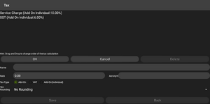 The top view is available tax and service charge that the system currently has configured. The bottom view is for user to create new or editing existing tax or service charge.